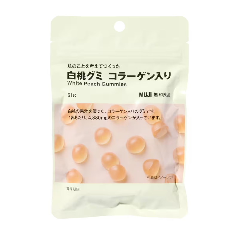 Ingredients: Starch syrup (Japan), sugar, gelatin, condensed peach juice, vegetable oil, starch, sorbitol, acidulant, emulsifier, flavoring, glazing agent, carotenoid color
