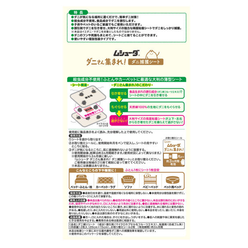 Placed anywhere mites are a concern for simple protection. No insecticidal ingredients—uses food-grade attractant. Safe for homes with children and pets. Attracts mites and traps them on a large, double-sided adhesive sheet (not for bird mites or ticks). Captures mite droppings and carcasses, disposable whole. Individually wrapped for convenience.