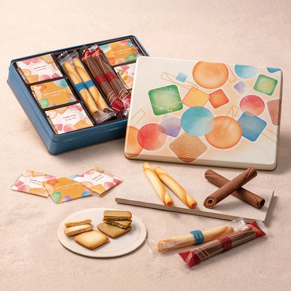 Four varieties of cookies, including buttery plain and cocoa cigar cookies, chocolate strawberry cookies, and double chocolate cookies. Perfect as a gift or for sharing with friends and family.